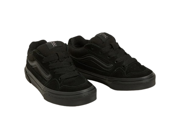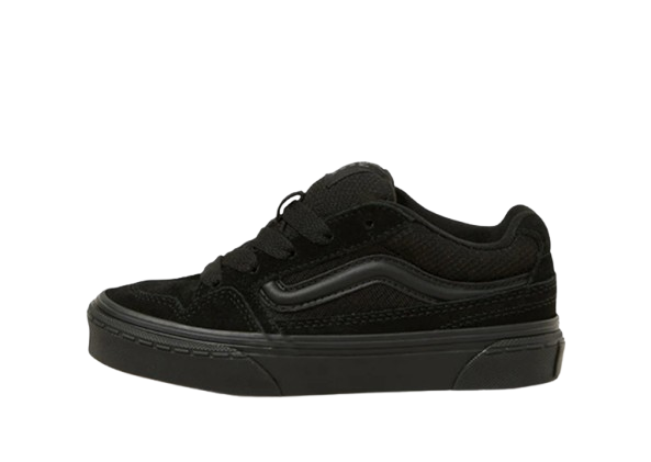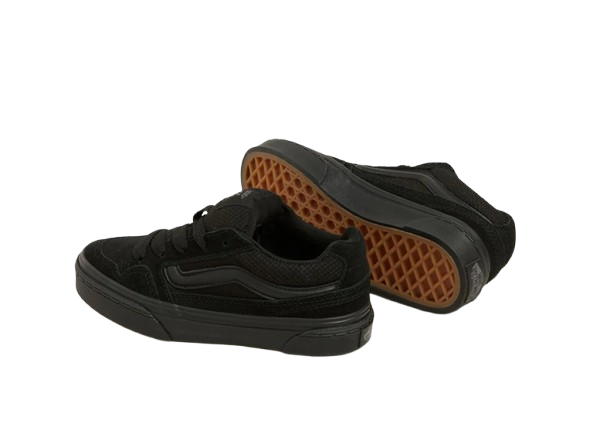 נעלי ה- Caldrone אלו לילדים מבית המותג וואנס נוחתות בזמן הנכון. סניקרס בעלי גפה קנבס ובטנת טקסטיל, בסגירת שרוכים ובהתאמה רגילה. לוחות הצד כוללים מראה רשת שחורה ופס הצד האייקוני מופיע באופן מובלט. לנעליים אלה יש גם סוליה חיצונית וופל. מיתוג Vans מופיע על הלשונית ותג הגומי של "Off The Wall" מופיע על העקב מאחור.